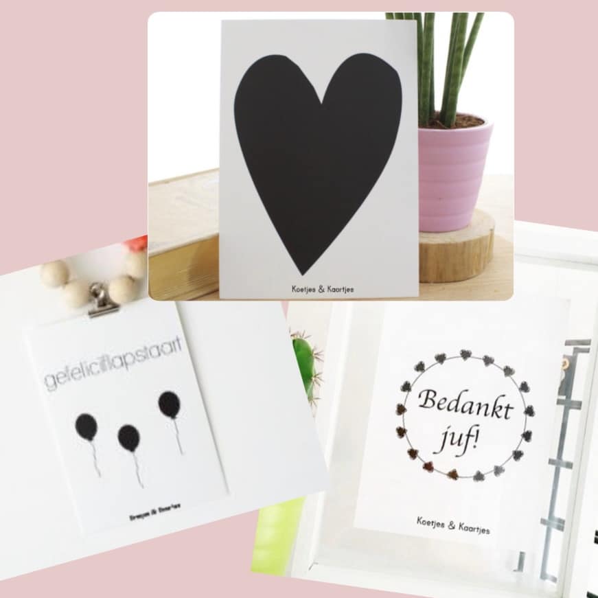Set van 3 populaire kaarten voor een extra leuke prijs! Kaart ‘Hart’ ‘Bedankt juf’ en ‘Gefeliciflapstaart’.